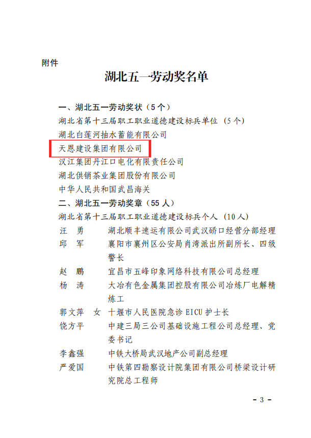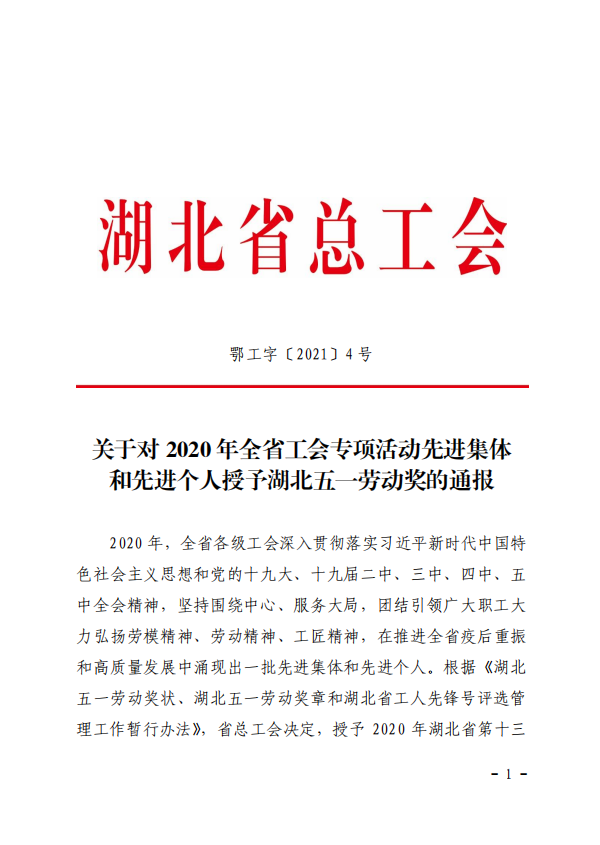 近日,從湖北省總工會(huì)《關(guān)于對(duì)?2020?年全省工會(huì)專項(xiàng)活動(dòng)先進(jìn)集體和先進(jìn)個(gè)人授予湖北五一勞動(dòng)獎(jiǎng)的通報(bào)》中獲悉,在2020年湖北省總工會(huì)組織開展的“職工職業(yè)道德建設(shè)”專項(xiàng)活動(dòng)中,天恩建設(shè)集團(tuán)有限公司取得優(yōu)異成績(jī),榮獲“湖北五一勞動(dòng)獎(jiǎng)狀”。