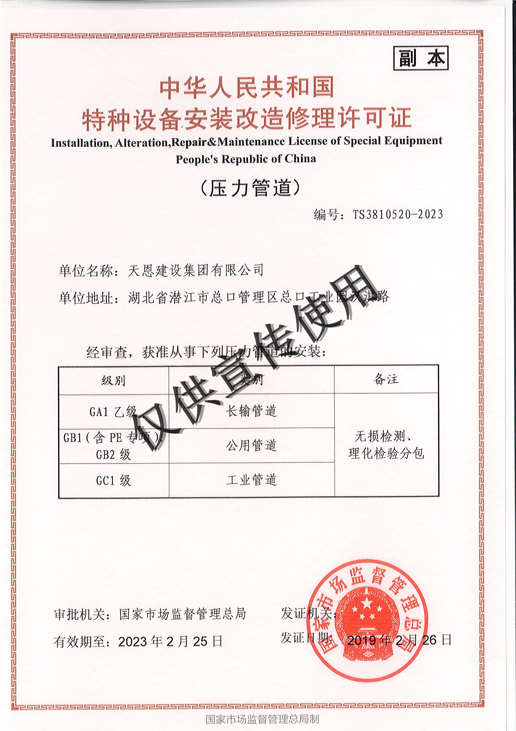 壓力管道 特種設(shè)備安裝改造維修許可證